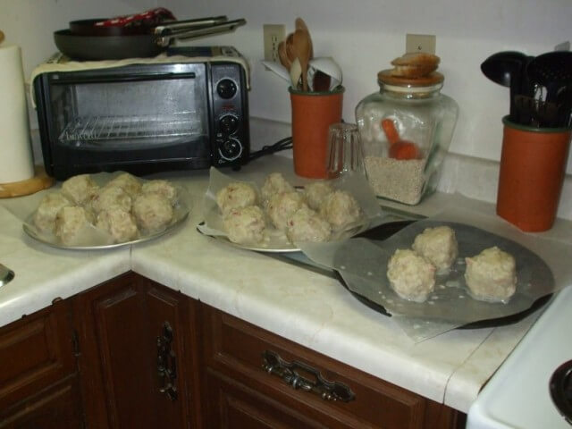 Stir the salt pork into the potato mixture. Form the dough into balls. Turn the heat up to high and bring the water to a boil. Add the potato balls to the boiling liquid. Let the liquid simmer for 1 hour or until the potato balls start to float.