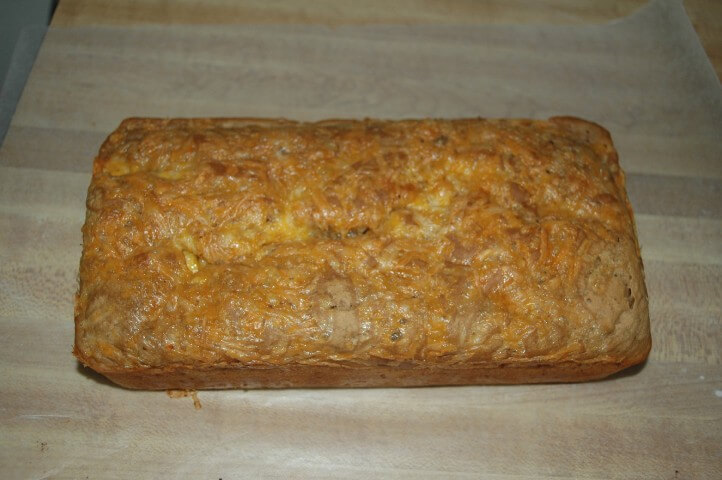 Quickly mix all ingredients together and spoon into a greased loaf tin and top with grated cheese. A large loaf tin will take 1 hour but smaller tins 35-40 minutes.