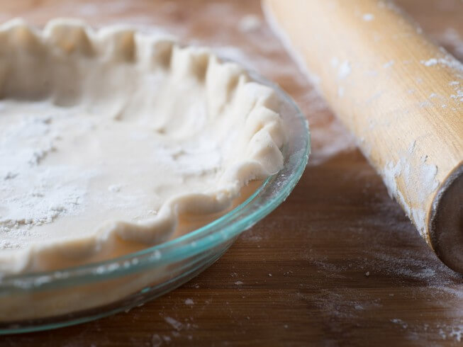 Place the dough in a pie plate and bake at 400 degrees F until lightly golden brown. Let cool then use as needed. Makes enough dough for one 8-inch pie crust.