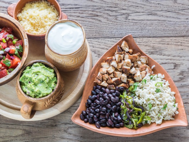 Mound rice onto plate; top with beans then add grilled chicken. Top the chicken with cheese and salsa. Finish with jalapeno, a dollop of sour cream, and guacamole.