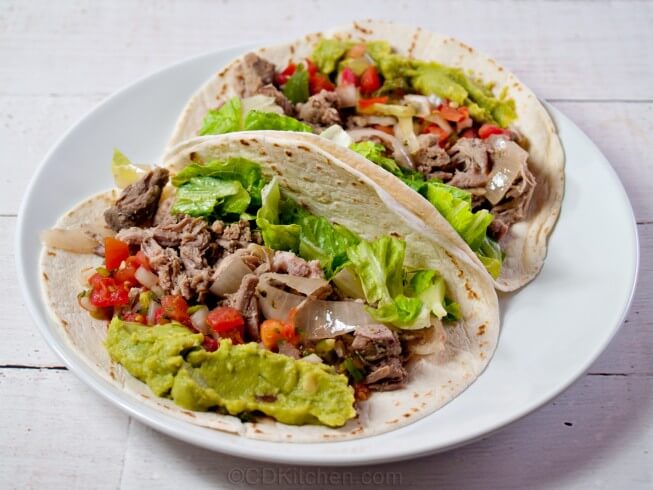 Transfer meat to a cutting board; cool slightly. Skim fat from juices; keep warm. Remove bay leaves; discard. Use 2 forks to gently separate the meat into shreds. Transfer shredded meat to a serving platter. With a slotted spoon, remove onions from juices. Transfer onions to same serving platter. Serve meat and onions in tortillas with small bowls of the hot juices and Pico de Gallo. If desired, pass lettuce and guacamole.