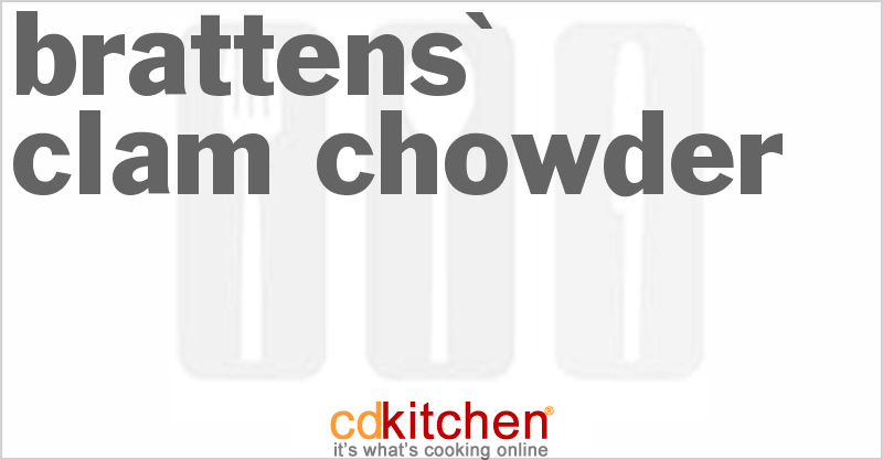 Recipe Location: https://www.cdkitchen.com/recipes/recs/222/Brattens-Clam-Chowder116359.shtml Recipe ID: 87232 Don't forget to stop back at CDKitchen and write a review or upload a picture of this recipe!