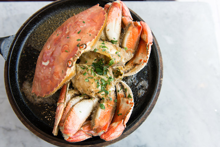 To the sexy seafood category I would like to add crab to the list of hands-on, messy foods that get you dirty in all the right ways. Conveniently, February is the peak of Dungeness crab season, making it the perfect opportunity to test the turn-on nature of this leggy ocean creature. Most fish mongers will steam the crab for you, crack it and clean it, making home cooking a simple matter of a quick reheat, and then some action from a few nimble hands.