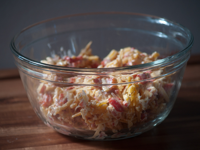You mix the cheese with mayo, pimento peppers, onion, Worcestershire sauce, garlic powder, dry mustard, black pepper, salt, cayenne, and Tabasco. I've seen other versions that also include jalapenos or dill pickles.