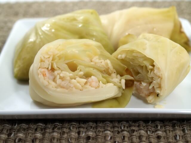 So when I found the recipe for seafood stuffed cabbage rolls I knew I had to try it. Instead of rice it called for orzo. The cabbage leaves were stuffed with chopped shrimp, orzo, and some seasonings. Simple