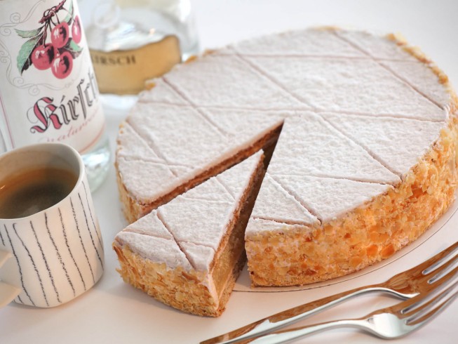 Ingredients: ***Meringue Japonaise*** 1/3 cup blanched almonds 1 cup sugar 1/2 tablespoon all-purpose flour 4 egg whites ***Sponge Layer*** 1/2 cup all-purpose flour 6 tablespoons cornstarch 5 tablespoons butter 2 eggs 2 egg yolks 1/4 cup sugar ***Kirsch Syrup*** 1/3 cup water 3 tablespoons sugar 1/3 cup kirsch ***Butter Cream*** 1 cup sugar 3/4 cup water 1 cup confectioners' sugar 4 egg yolks 1 tablespoon kirsch 1 cup butter, at room temperature ***For Assembly*** 1 cup sliced, toasted almonds confectioners' sugar