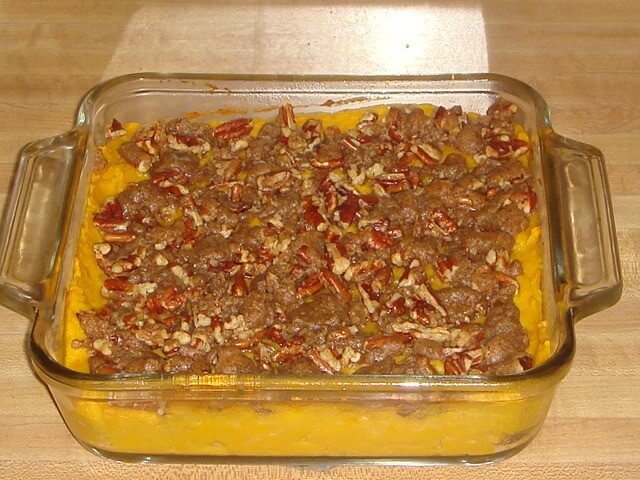 Transfer potato mixture to reserved baking dish and smooth the top. To make the topping: In a small bowl, mix butter, brown sugar, flour, pecans, cloves, cinnamon, nutmeg and salt well, then sprinkle evenly over potatoes.