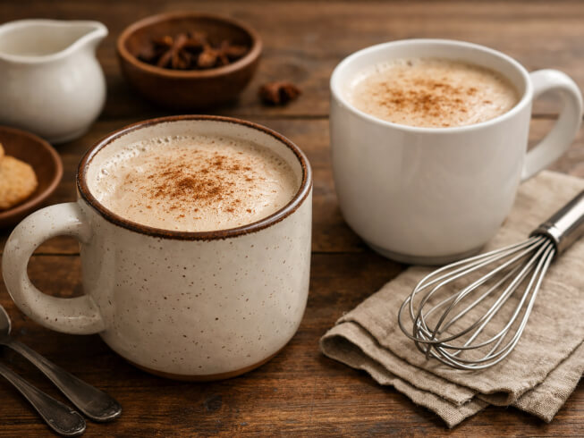 Stir in remaining ingredients. Heat to boiling. Stir with wire whisk to foam milk.
