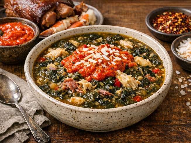 Serve hot in bowls, allowing 1 generous cup of the callaloo per portion. Drizzle each serving with a generous 3 tablespoons of the Rouille and sprinkle with 1 tablespoon of coconut.