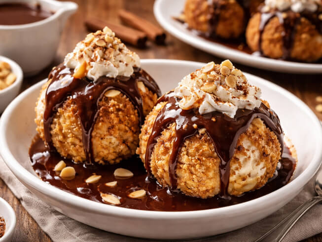 Vanilla ice cream coated in graham cracker crumbs and almonds, then fried until golden brown. Serve topped with a Mexican-style cinnamon-fudge sauce for added indulgence.