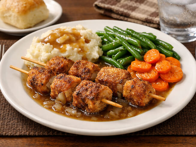 Cut pork into 2 inch cube. Put cubes on sticks. Dip in beaten egg. Roll in bread crumbs and fry in skillet until golden brown.