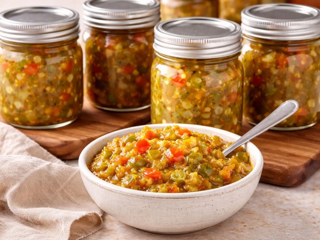 Remove from the heat and spoon into 1/2-pint preserving jars, filling the mixture to within 1/2-inch of the top. With a clean damp towel, wipe the rim and fit with a hot lid. Tightly screw on the metal ring. Process in a hot water bath for 15 minutes.