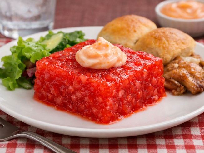 Serve with a small dollop of mayo flavored with a small amount of French dressing. This is a fairly dense salad, and easily goes into individual tart pans or other molds suitable for gelatin.