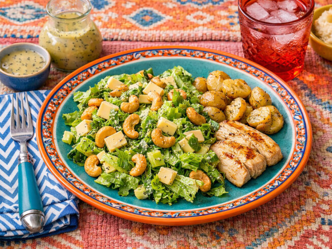 Crispy romaine lettuce is combined with salted cashews and Swiss cheese to create a texturally interesting salad. The dressing blends vinegar, oil, and poppy seeds for added zest.