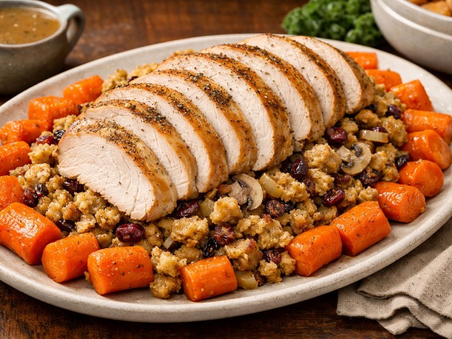 Remove turkey to a cutting board and slice. Place the carrots on a serving platter. Stir the stuffing until thoroughly mixed and allow to sit for 5 minutes.