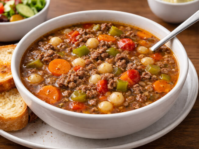 Brown meat in butter in six-quart sauce pan. Add onions, garlic, carrots, celery and green pepper. Simmer 10 minutes with the pan covered. Add beef broth or water with bouillon cubes. Add chopped tomato and pepper. Simmer soup on low heat for 35 minutes. Add hominy. Boil hamburger soup for 10 minutes more.