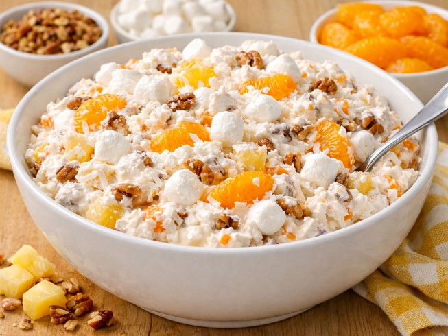 Combine the coconut, pineapple, oranges, marshmallows, and nuts in a bowl. Fold the whipped topping into the fruit mixture.