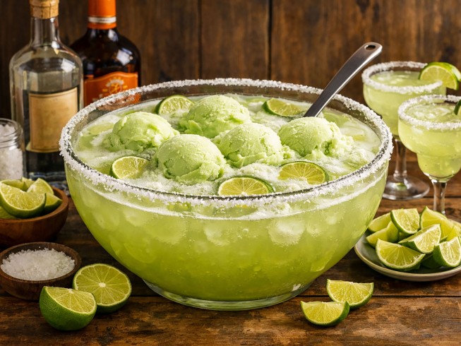 A great way to serve margaritas to a crowd. The traditional margarita ingredients of tequila, triple sec, and sour mix are combined with ginger ale and lime sherbet to create a creamy lime-colored punch.