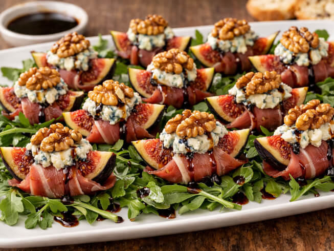 Wrap a piece of prosciutto around bottom of each fig quarter so that fig is nestled in prosciutto. Spread 1 tsp. gorgonzola over each fig and top each with a toasted walnut half.