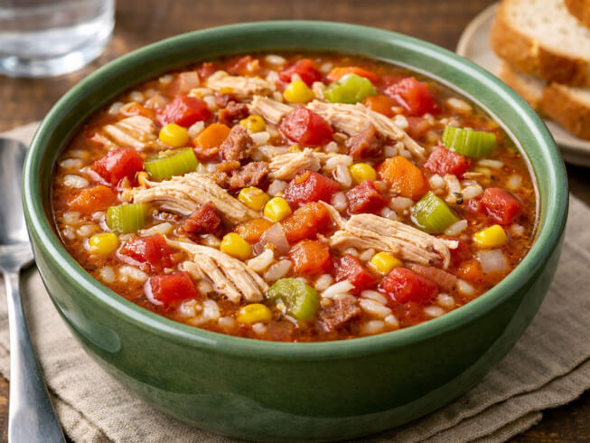 In a crockpot or slow cooker, combine turkey broth with diced bacon, tomatoes, carrots, celery, onion, rice, and salt. Cover and cook on low for 6 to 7 hours. Add corn kernels and turkey; cover and cook an additional 45 minutes to 1 hour.