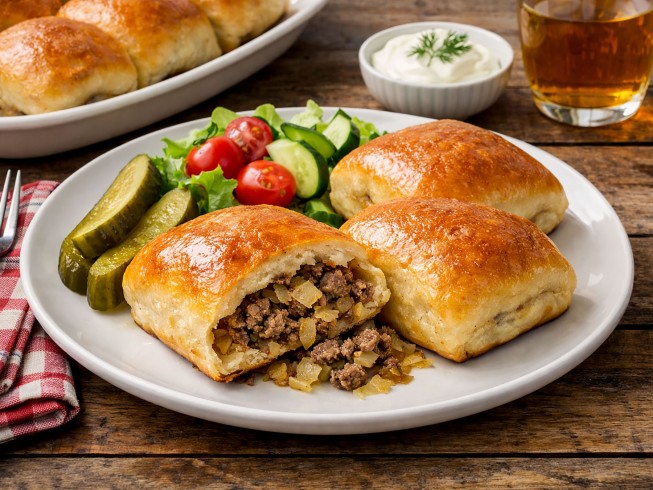 Brown beef and onion in heavy skillet in a small amount of oil. Add cabbage, salt and pepper (don't drain). Steam until cabbage is tender and lightly brown, let cool. Roll dough 1/4" thick and cut in 2 1/2" squares.