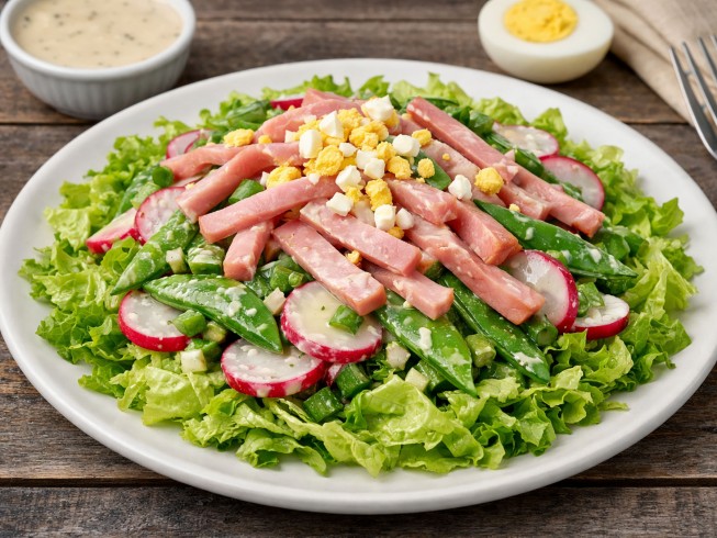 To serve: Place lettuce on individual salad plates, dividing evenly. Spoon snow pea mixture onto lettuce; arrange ham strips on top. If desired, garnish with chopped hard-cooked egg.