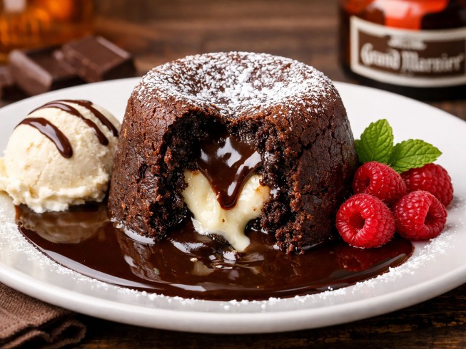 In a separate bowl, combine four eggs, four yolks, and Grand Marnier. Add this to the chocolate mixture and beat until well mixed. Cover and chill overnight.