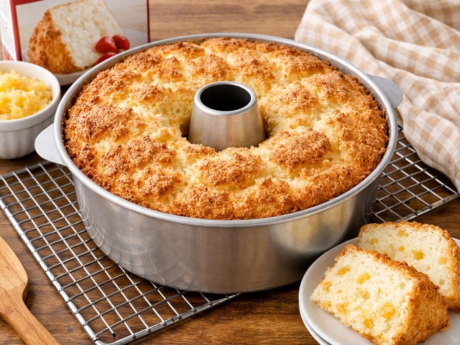 I made this last minute and couldn't locate my angel food cake pan so made it in 13x9. Whats more, I had to crush pineapple slices in food processor. Mixed it up, put in pan and when it came out of oven, put on coconut. Beautiful! Add whipped cream, done. I like presentation as well as anyone but was delighted with this outcome!