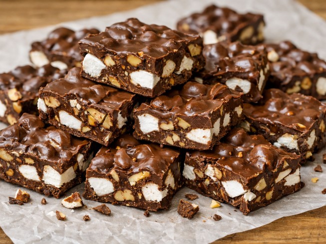 Melt chocolate over double boiler until completely melted. Pour 1/2 of the melted chocolate in a buttered paper lined tray or dish. Sprinkle and cover with the marshmallows and nuts.