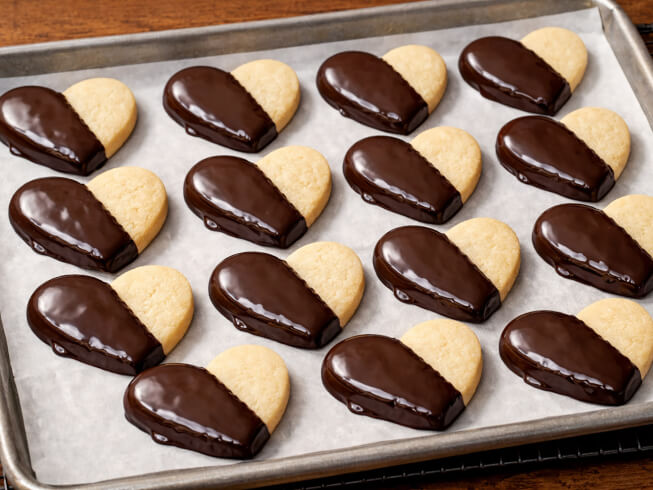 For glaze, in a small saucepan, melt chocolate and butter, stirring occasionally, over low heat until melted (4 to 6 minutes). Dip half of each heart into chocolate.