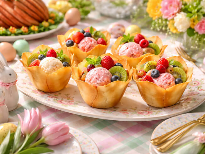 If cookie is too firm to mold, return to oven for 15-30 seconds or until softened. (Cookie shells can be stored in airtight container for up to two day. Re-crisp in 275 degrees F oven for one minute. When ready to serve, fill with ice cream, sherbet, or fresh fruit.