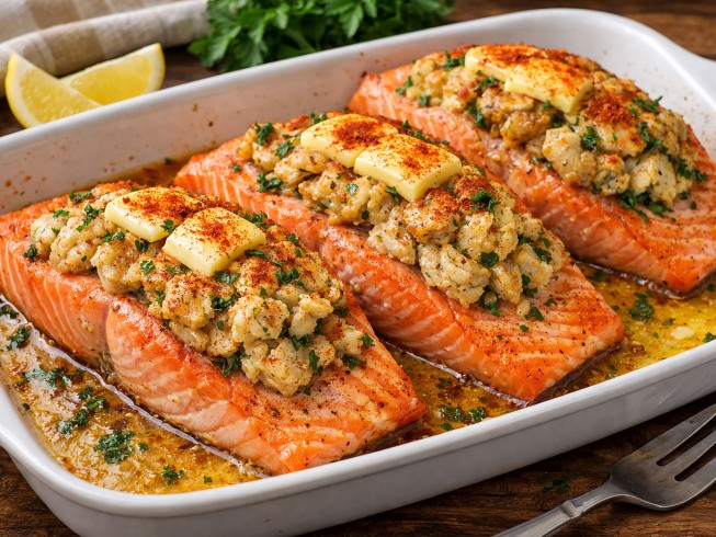 My wife won't eat salmon with crabmeat out at a restaurant now. She prefers this recipe and eating in!