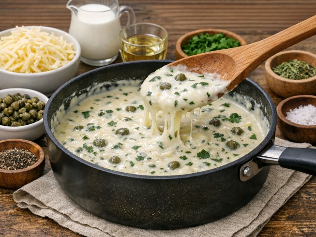 Add cheese, capers, tarragon, parsley, salt, pepper, cream, and vermouth. Cook and stir over low heat until cheese melts.