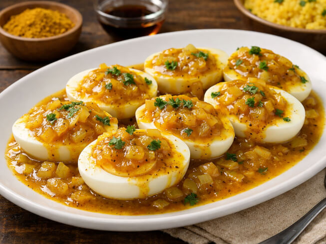 Arrange halved eggs on a warm dish, and spoon on the curry sauce.