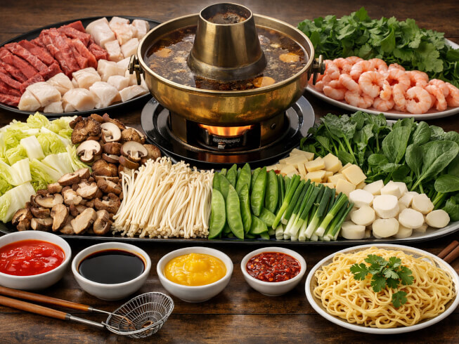 To serve, arrange beef, chicken, fish, shrimp, cabbage, forest mushrooms, enoki mushrooms, snow peas, green onions, spinach leaves, water chestnuts and bamboo shoots in individual rows on large platters or serving plates. Bring broth to boil. Place heating unit under Chinese hot pot and pour boiling broth into hot-pot bowl.