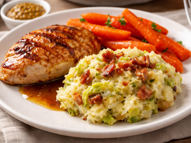 Drain the cooked potatoes, mash with milk and season with salt and pepper. Fold in the cabbage and onions, then transfer the mixture to a large serving bowl. Make a well in the center, and pour in the melted butter or else make it into a cake and fry till browned.