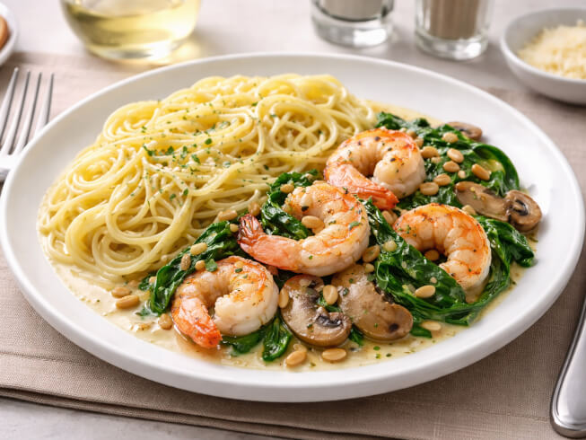 A creamy lemon butter sauce enhances the flavors of shrimp, mushrooms, and pine nuts in this copycat Macaroni Grill pasta recipe. Quick to prepare, this dish takes advantage of fresh ingredients for a filling weeknight meal.