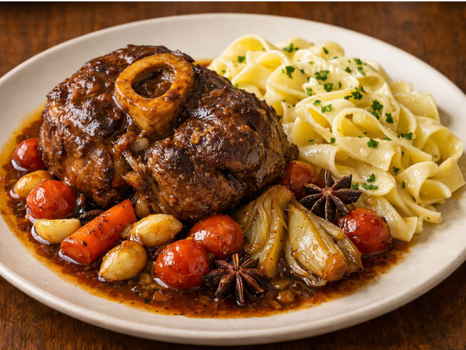 Add the rest of the ingredients to the pan and roast for 2-1/2 to 3-1/2 hours, until the meat easily falls off the bone. Remove anise pieces and serve the shanks and vegetables over buttered noodles.