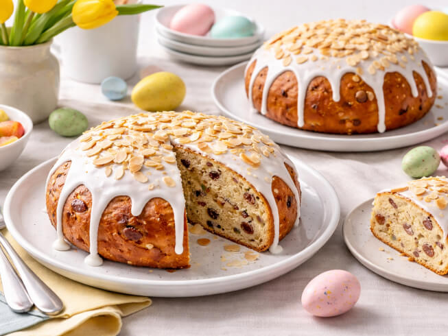 Punch dough down; turn out onto lightly floured surface. Knead in dates and almonds. Divide dough in half; shape into 2 balls. Place in 2 greased 8-inch round cake pans. Cover; let rise in warm, draft-free place until doubled in size, about 1 hour.