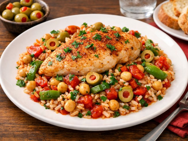 In a 3.1/2-qt. or 4-qt. electric cooker, mix together the garbanzo beans, rice, onion, bell pepper, tomatoes with their liquid, water, garlic powder, saffron, and 1/3 cup of the olives.