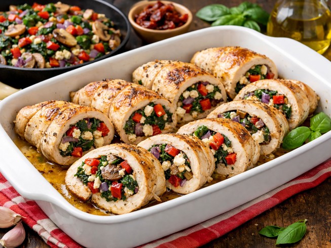 This was a great recipe! It takes about 1/2 hour to prep. I used herb scissors to cut the spinach and basil and purchased extra spinach and used it as a base layer for the chicken. I also poured the oil from the sun-dried tomatoes over the chicken and draped aluminum foil over it to bake. It was delicious and my guests wanted the recipe! Huge hit!!!