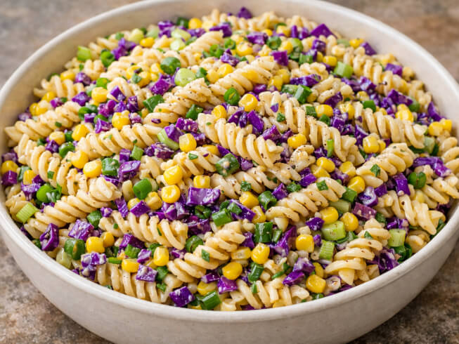Combine the corn, cooked pasta, and remaining ingredients in a large mixing bowl and toss to thoroughly combine.