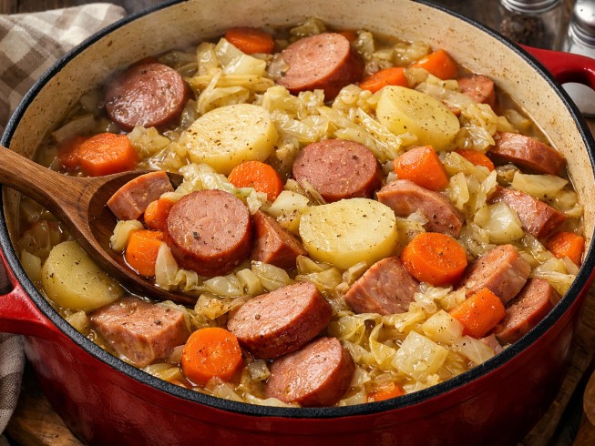 Combine the bologna, cabbage, potatoes, carrots, beef broth, black pepper, and salt in a Dutch oven over low heat.