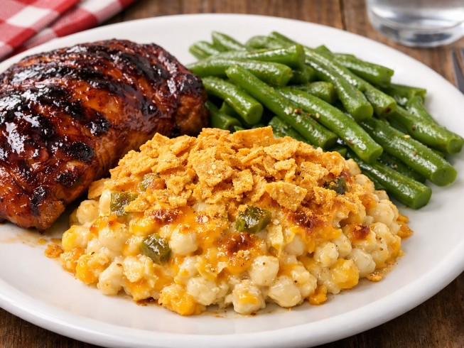 Cover with corn chips. Sprinkle with grated Cheddar cheese.