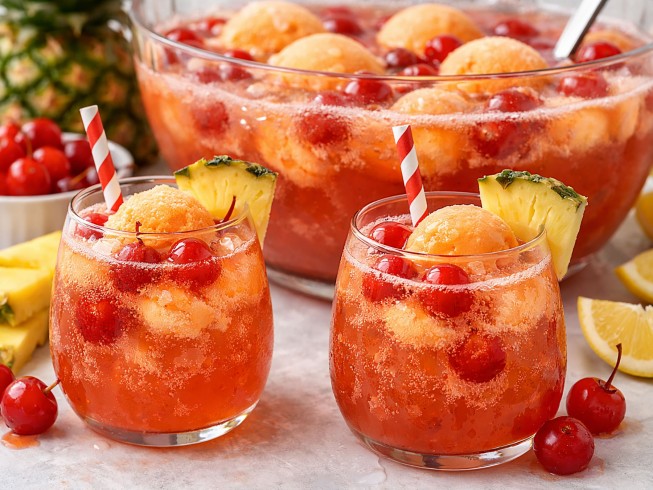 Great summer drink because the sherbet keeps the punch cold while it melts. You can also freeze the cherries in some gingerale in ice cube trays if you need to keep it cold longer.