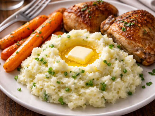 Drain, peel, and mash the potatoes. Beat in the milk mixture until smooth. Serve immediately.