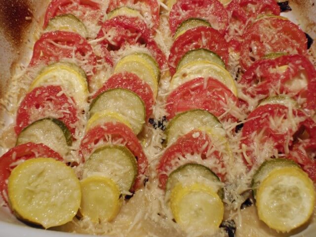 This was a nice way to serve a variety of vegetables! All of the veggies were done perfectly and had plenty of flavor. The sharper tomato flavor helped balance out the milder flavor of the squash. It is a very attractive dish as well. We weren't sure exactly what the directions meant by "upright rows" so we just layered the slices slightly overlapping in rows.