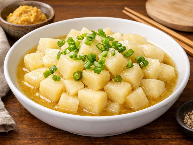 While water is coming to a boil, peel kohlrabi. Cut kohlrabi into large cubes that are still bite sized. Add kohlrabi to miso. Bring back to a boil then reduce to a simmer. Cover with a lid and let simmer about 15 minutes, until a paring knife can easily pierce the kohlrabi.