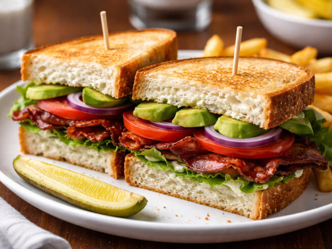 Spread half of mayonnaise mixture over 1 side of half the bread slices. Top each with 2 tomato slices. Sprinkle tomatoes with salt and pepper. Top tomato slices with avocado, then with bacon strips, onion and lettuce. Spread remaining mayonnaise mixture over remaining bread slices. Place bread slices atop lettuce. Cut sandwiches in half and serve.