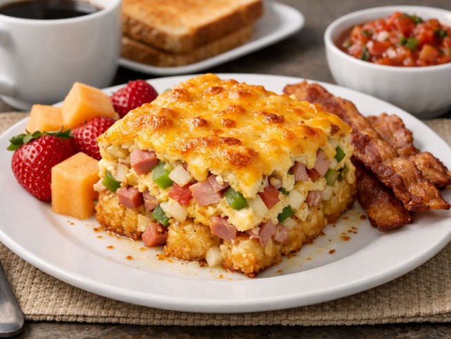 I was looking for a slow cooker hash brown recipe and realized my husband bought tater tots instead of shredded hash browns not realizing what I was cooking. I saw this and thought "breakfast saved!" Only change I made was to use sliced, cooked sausage and some chopped/fried bacon instead of the ham. Seems like a very flexible recipe so I'll probably experiment with other ingredient substitutions just to change things up. Oh, and I cooked it on low for 5 hours and it was good. Totally depends on your crock pot I've found.